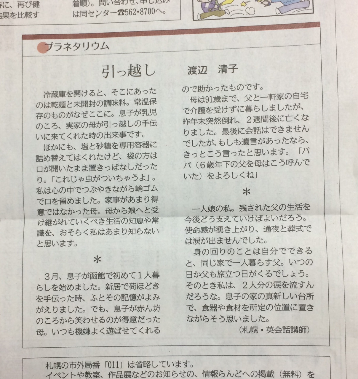 2018/09/14 / 最終更新日 : 2018/09/14 sugama q こぼれ話 (号外)道新プラネタリウム欄 今日の夕刊にSeiko先生の記事が載りました。 先生はじゃれマガでも道新でも大活躍です。 英語クラブを1週間無料で試せます!1週間、英語クラブを無料でお試しいただけます。お気軽にお申し込みください。お問合せ、お試しお申し込みはこちらをクリック ↓ 英語クラブ1週間「無料お試し」提供中FacebooktwitterHatenaPocketCopy “(号外)道新プラネタリウム欄” に対して1件のコメントがあります。 Seiko より: 2018/09/15 10:32 先生、お忙しいなかご紹介くださり、本当にありがとうございました。 返信 コメントを残す コメントをキャンセルメールアドレスが公開されることはありません。コメント 名前 メール サイト Δ