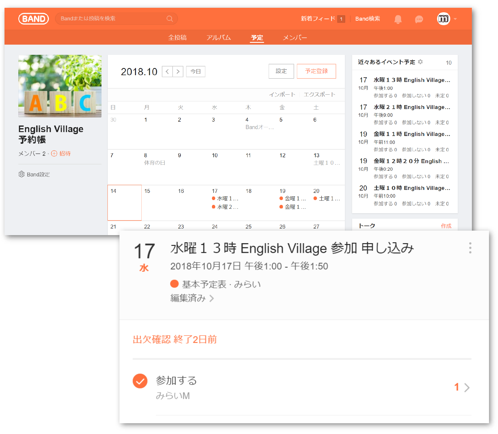 写真は「English Village予約帳」サイトです。パソコンやスマホから簡単に参加予約が入れられます。現在何人が予約中かもわかります。トピックもわかります。